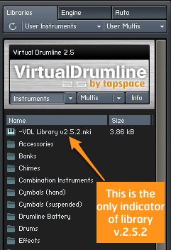 Library 2.5 was the original version of VDL 2.5 that came on the Virtual Drumline 2.5 DVD in 2007. This will show library version 2.5 listed in the "Library Info" window of Kontakt Player 2. It is highly recommended that you update to library version 2.5.5 (available from Tapspace webstore) and Kontakt 5 (free from Native Instruments).
